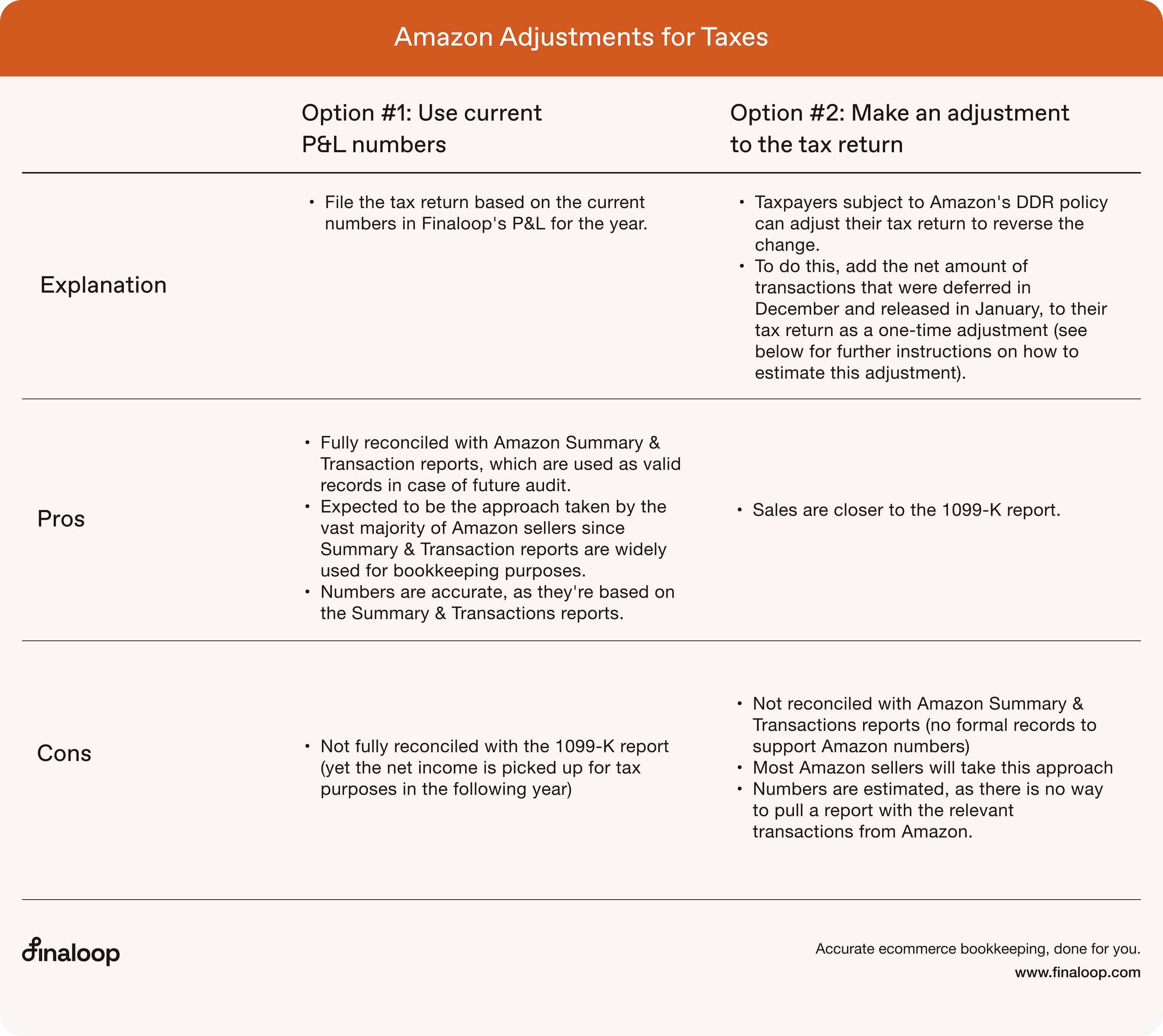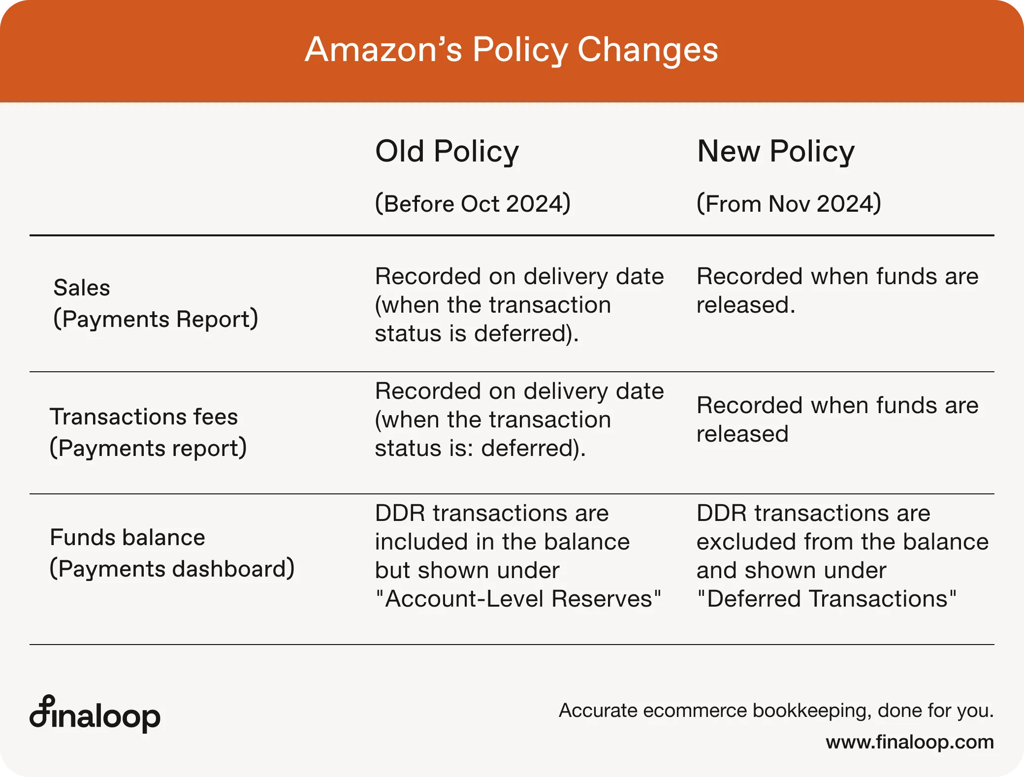 As an ecommerce bookkeeping service and Amazon accounting software, Finaloop automatically syncs and reconciles your Amazon transactions in real-time. Since our native integration with Amazon relies on Amazon’s Finances API, our reports align with the updated Summary & Transaction reports. That means, from November 2024, transactions are recorded in Finaloop's P&L on the release date (and may be different than what you see in your Amazon Sales Dashboard).