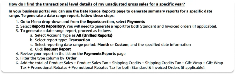 This inconsistency creates internal contradictions between Amazon’s different reports, making it more challenging for sellers and their accountants to reconcile their financial data accurately. Especially, since Amazon’s own reconciliation instructions in the 1099-K form direct sellers to the Summary & Transaction reports (see below), even though the 1099-K form issued by Amazon is not reconciled with their Summary & Transaction reports.