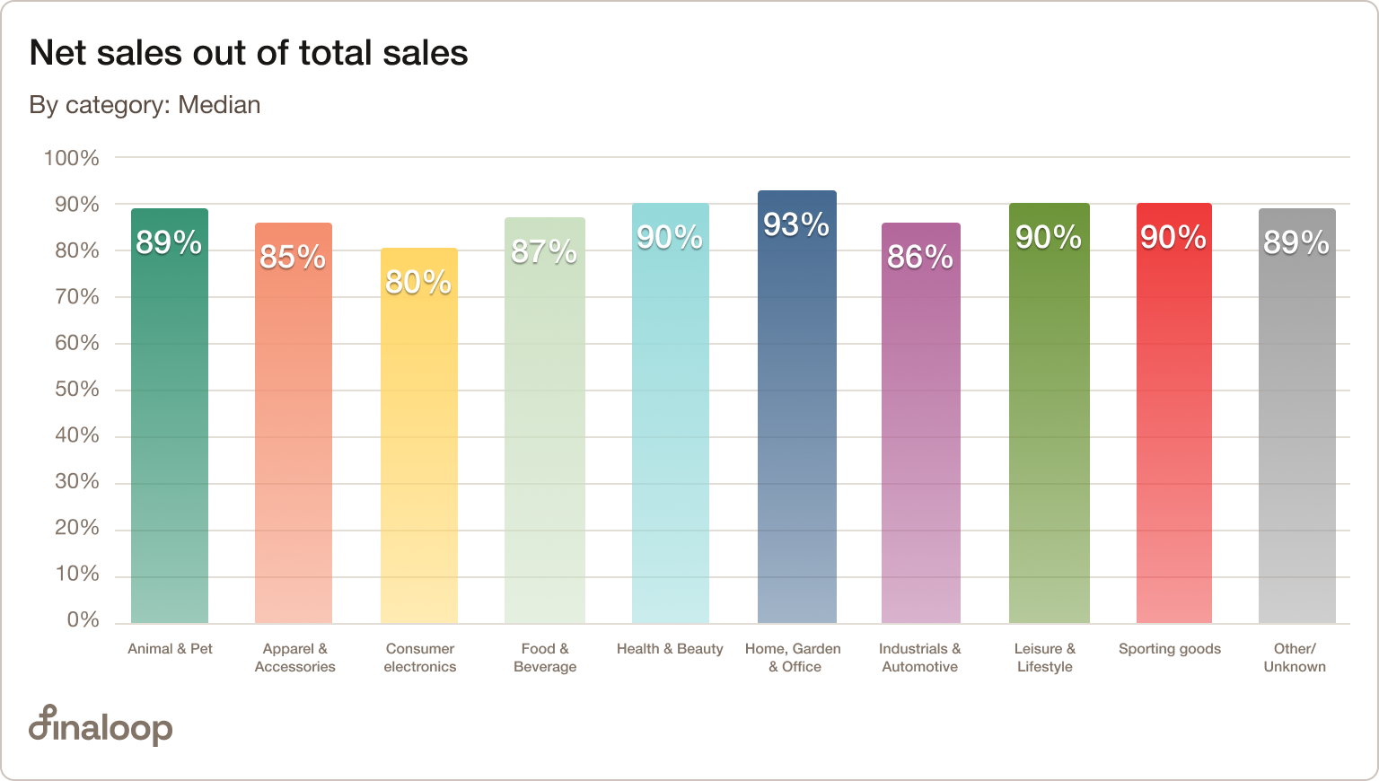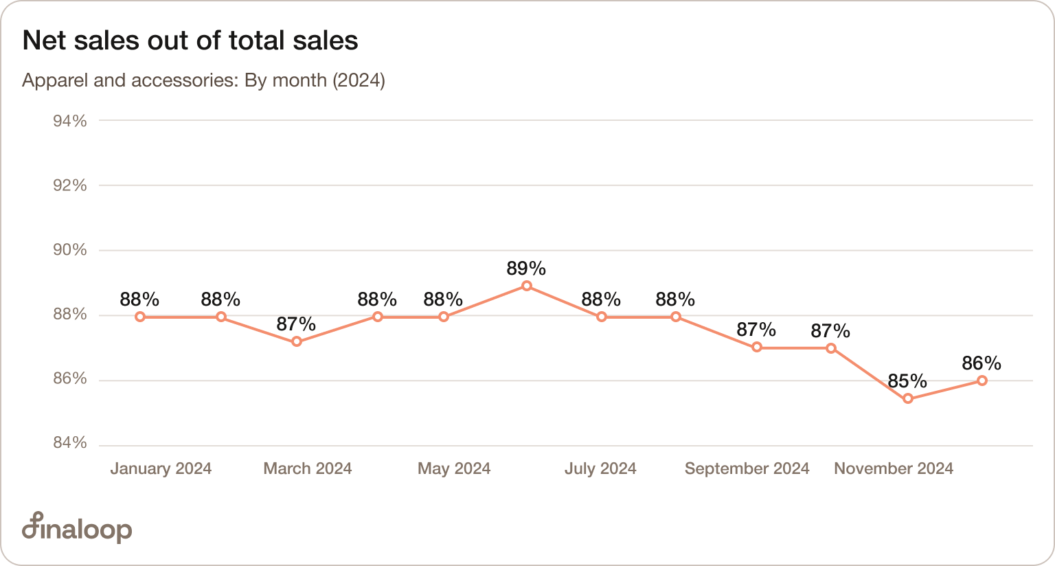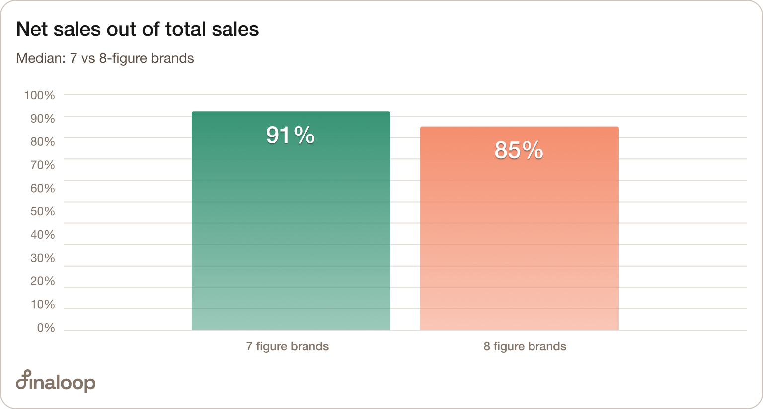 Net sales out of total sales (%) subtracts refunds, returns, and discounts from total sales ($) and divides this number by total sales.