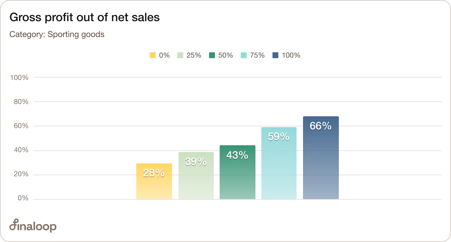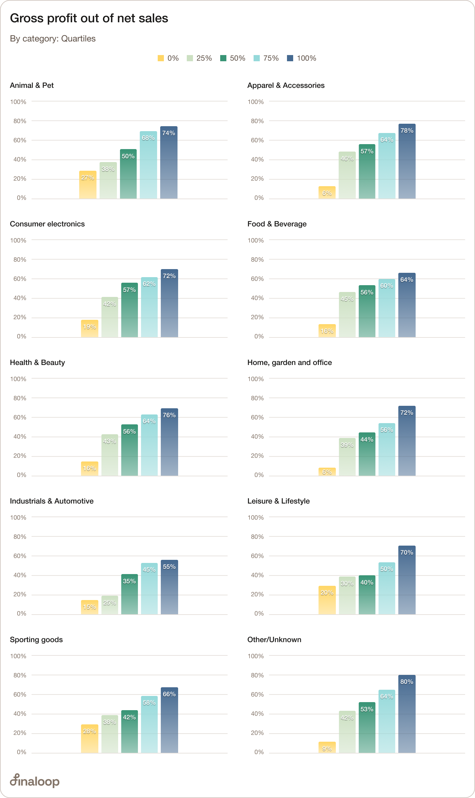 When looking at gross margin median breakdown by industry, the figures range from 43% for sporting goods to 66% for leisure and lifestyle. The rest of the categories fall somewhere between them.