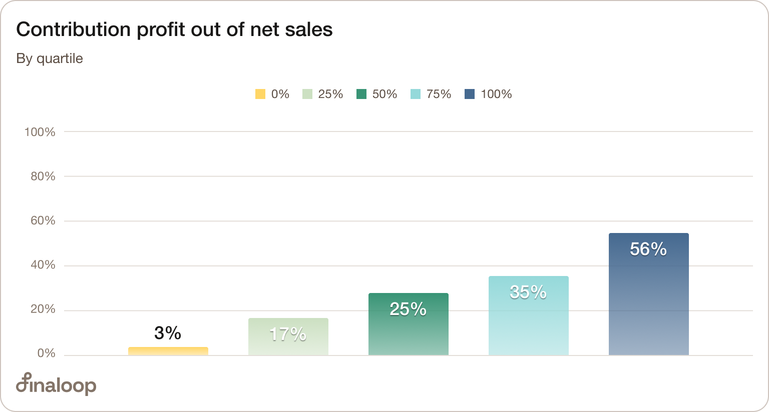This figure is spread across quartiles, as the top-performing brands have about 56% contribution margin, while the bottom-performing brands are just about 3% at the contribution margin level.