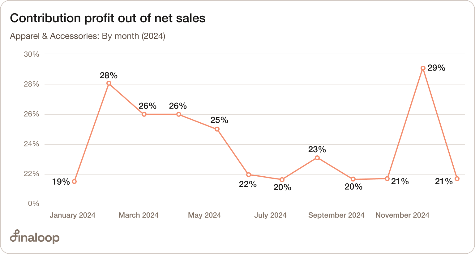Unlike gross profit, contribution margin shows seasonal trends. The apparel industry, for instance, ranges from 29% in Nov to 19% in Jan.