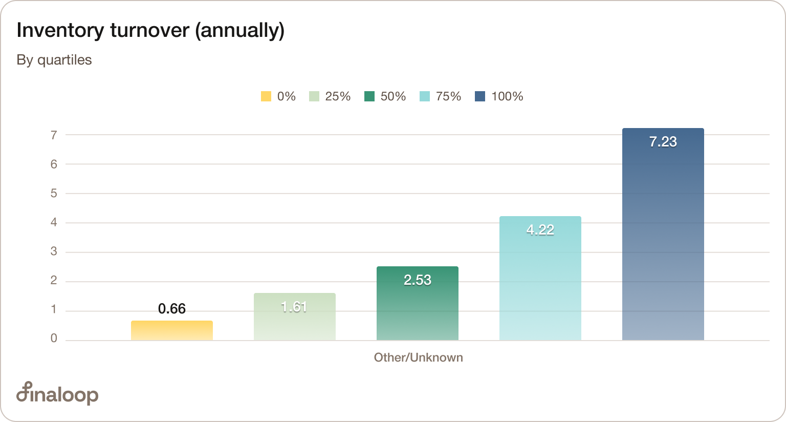Inventory turnover, the inverse of DIO, shows similar data in 2024, ranging from turnover of over 7 (highest performing quartile), down to 0.66 (on an annual basis!).