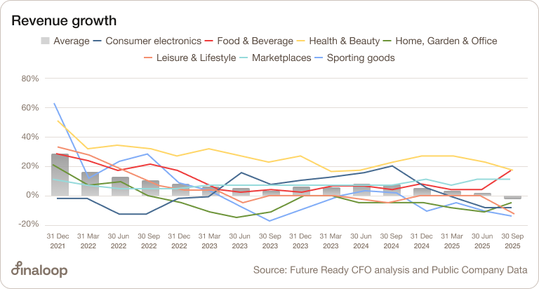 Looking at Revenue Growth across industries really shines a light on just how varied the lives of ecommerce founders must be in today’s environment.