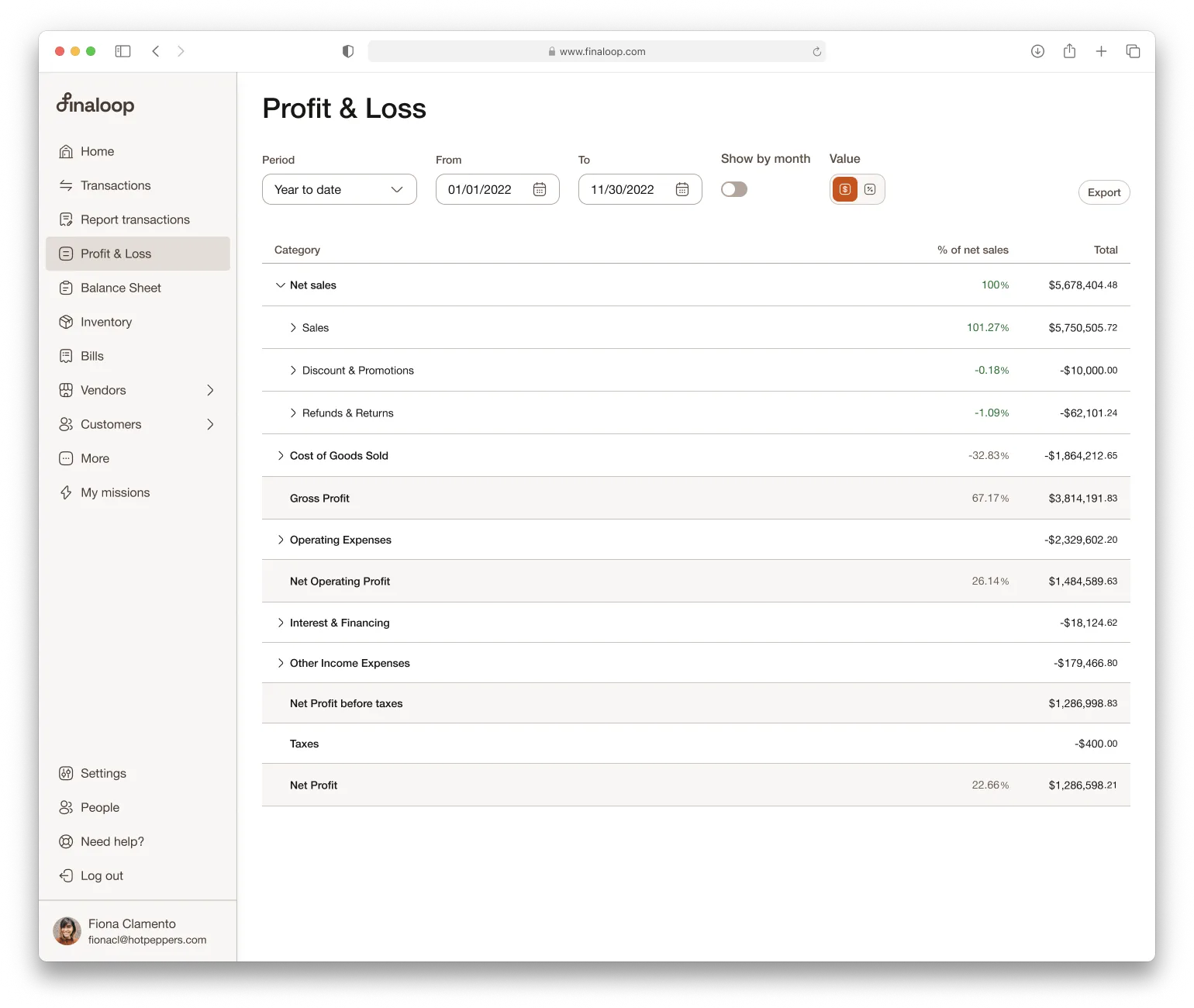 Also known as an income statement, the P&L provides a summary of company revenues, expenses, and net profit or loss over a specific period - typically monthly, quarterly, or annually (or, if using Finaloop, daily). It shows the brand's revenues from sales of goods or services and lists all its expenses by main categories. The difference between the revenue and expenses is your profit or loss.